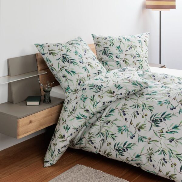 Die Janine Mako-Satin Bettwäsche modern art S 42152 von Janine bringt mediterranes Flair ins Schlafzimmer. Auf einem salbeigrünen Hintergrund verteilen sich detailreiche Olivensträucher, die dem Design eine natürliche und zugleich elegante Note verleihen. Den letzten Feinschliff erhält die Bettwäsche von Janine von dem seidigen Schimmer des hochwertigen Mako-Satins. Darüber hinaus legt sich das erlesene Material angenehm leicht auf Ihre Haut und bettet Sie wunderbar weich.